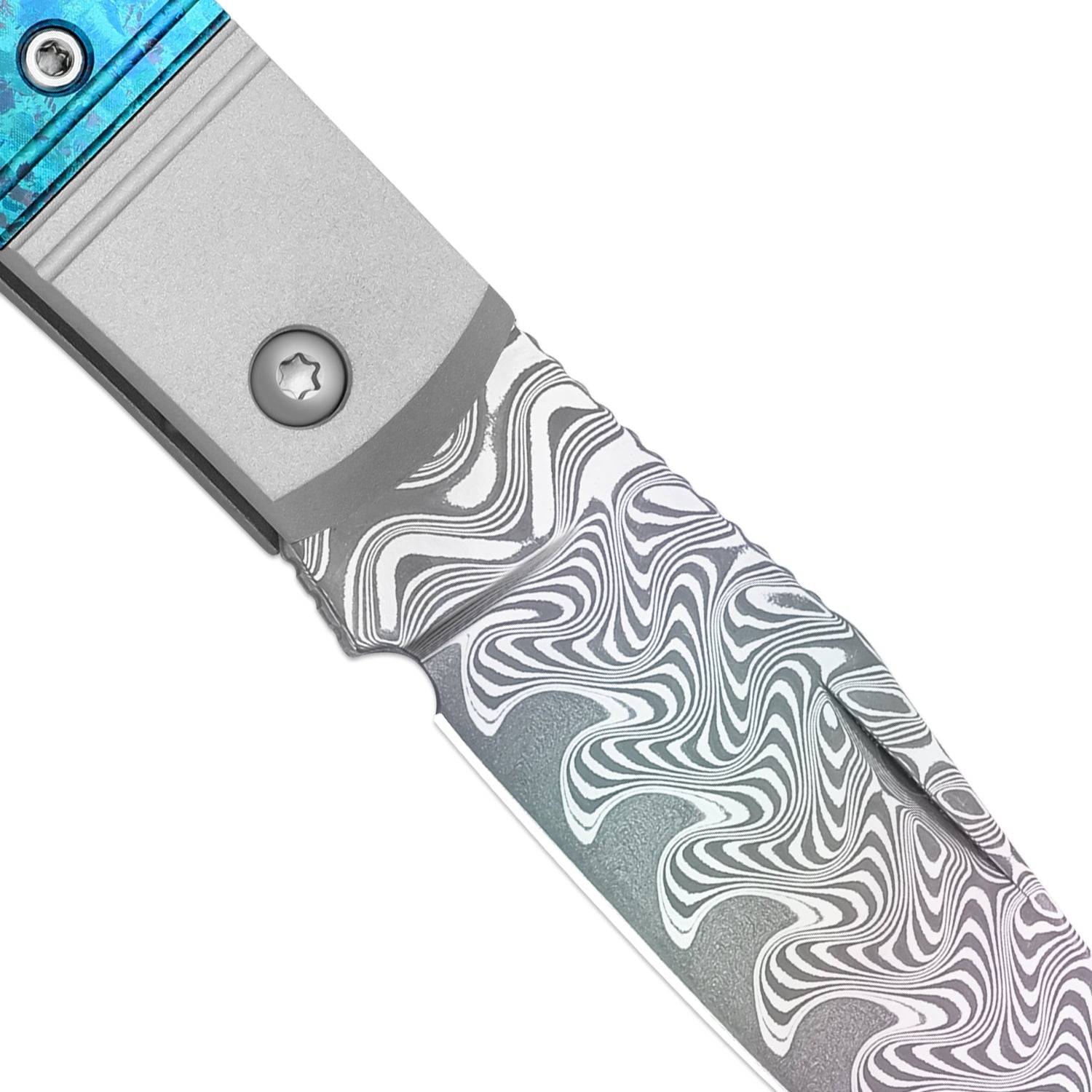 The Kizer Trestle represents precision engineering meets artistic craftsmanship. This limited edition slip joint features a stunning rainbow Damascus blade that showcases intricate layering and fluid patterns unique to each knife. The handle combines lightweight aluminum with crystallized titanium accents, delivering durability without excess weight. The slip joint mechanism ensures smooth, reliable operation for everyday carry or collection display. Designed for discerning knife enthusiasts who appreciate both functional performance and aesthetic excellence, this is a piece that commands attention.